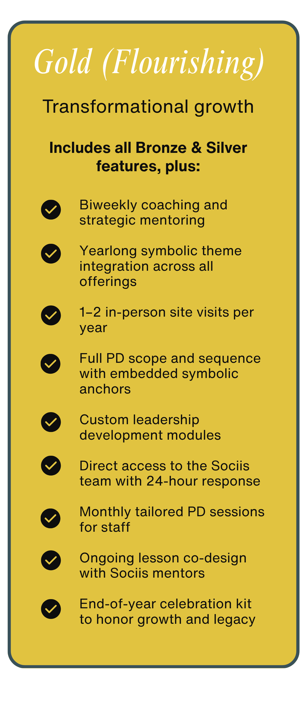 At Sociis Education, we specialize in helping schools and districts build that vision and leave a lasting legacy. Through customized partnerships, we mentor educators and leaders—from new teachers to seasoned leaders—to reconnect with their purpose, deepen their skills, and navigate change with confidence. Our approach strengthens teacher recruitment and retention, supports the development of new leadership, and fosters a resilient, inspired, and future-ready learning community.