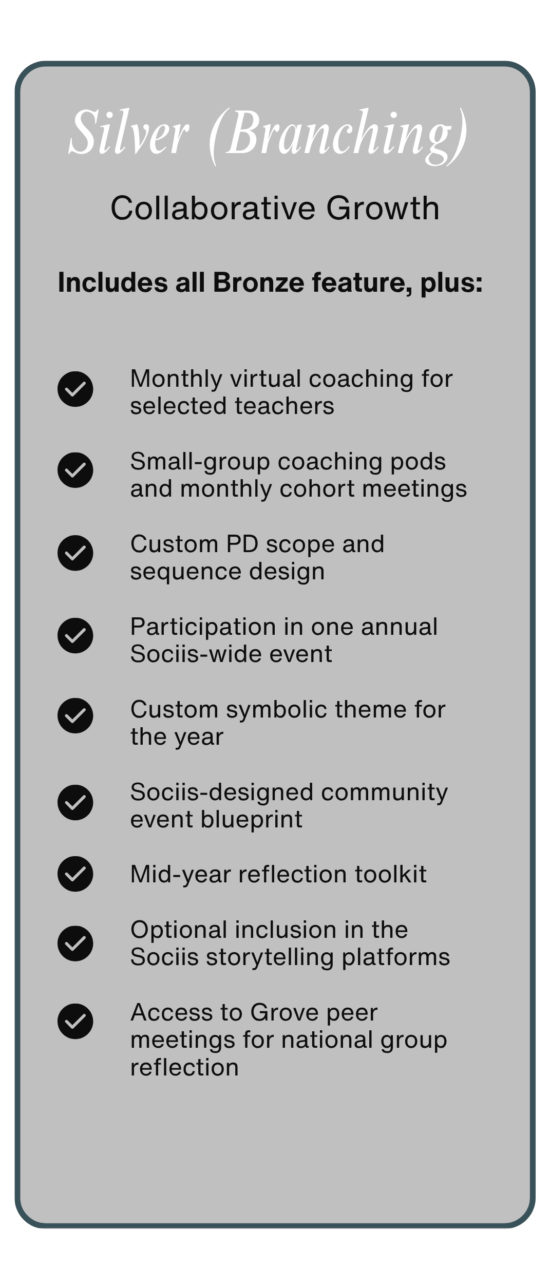Access to Grove gatherings across the country that unite educators and leaders from similar school systems and cultural contexts, creating space for peer support, shared reflection, and meaningful feedback.