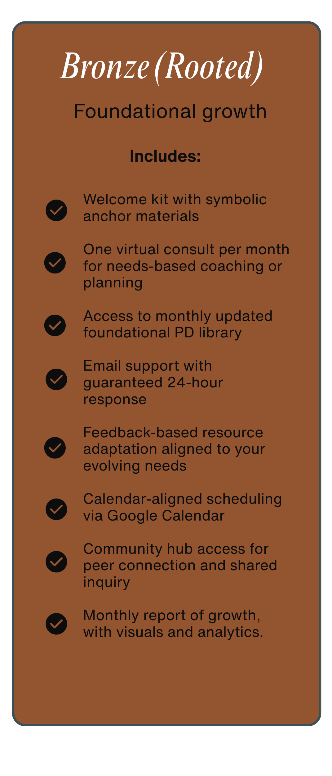 This model is more than a service—it’s an invitation to invest in proactive relational health. We walk alongside schools through all seasons—times of crisis and transition, yes, but also the quieter moments of growth, reflection, and renewal. These services flex with your school’s seasons, priorities, and capacity. We do not offer “one-and-done” professional development. Instead, this model reflects our commitment to being present, available, and always relevant in current best practices and research.